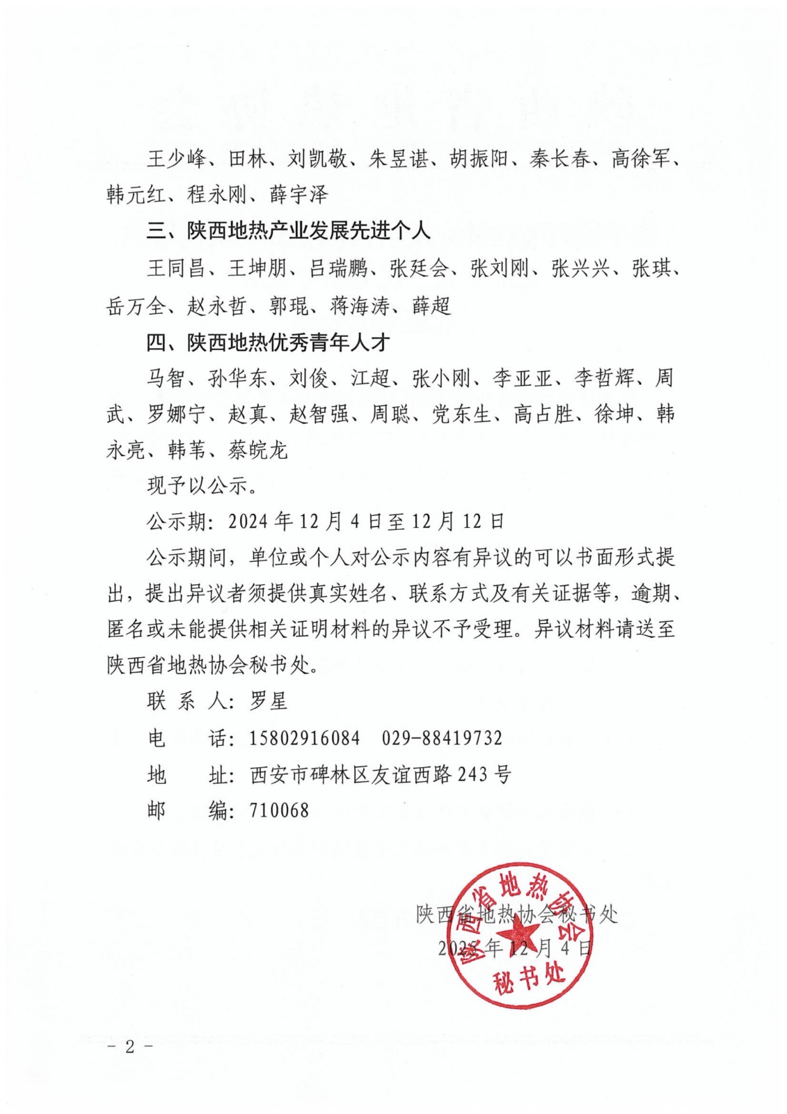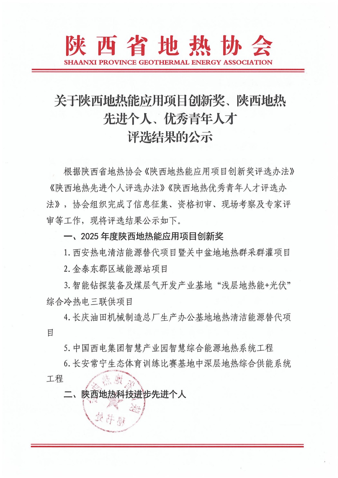 关于陕西地热能应用项目创新奖、陕西地热 先进个人、优秀青年人才 评选结果的公示